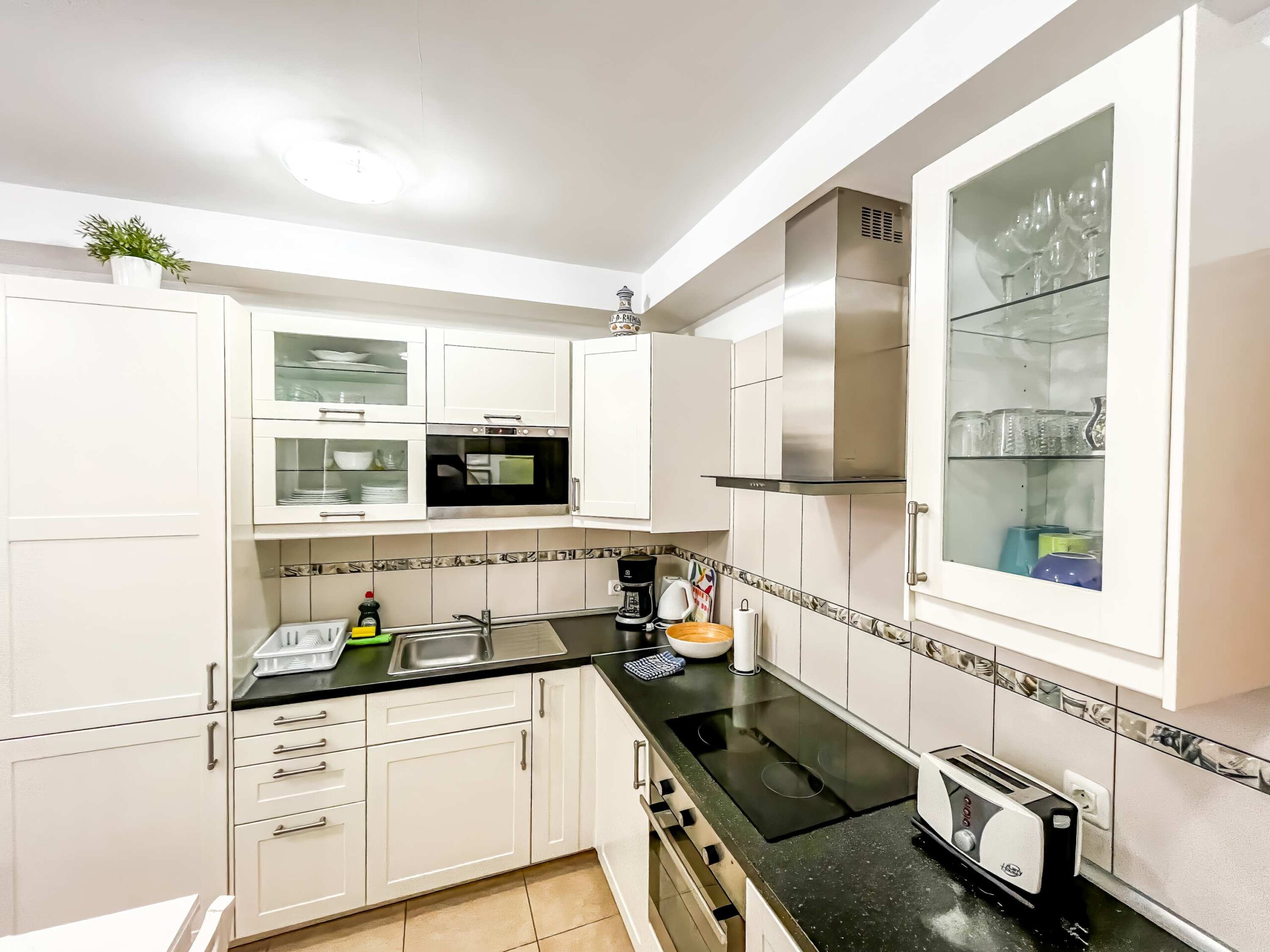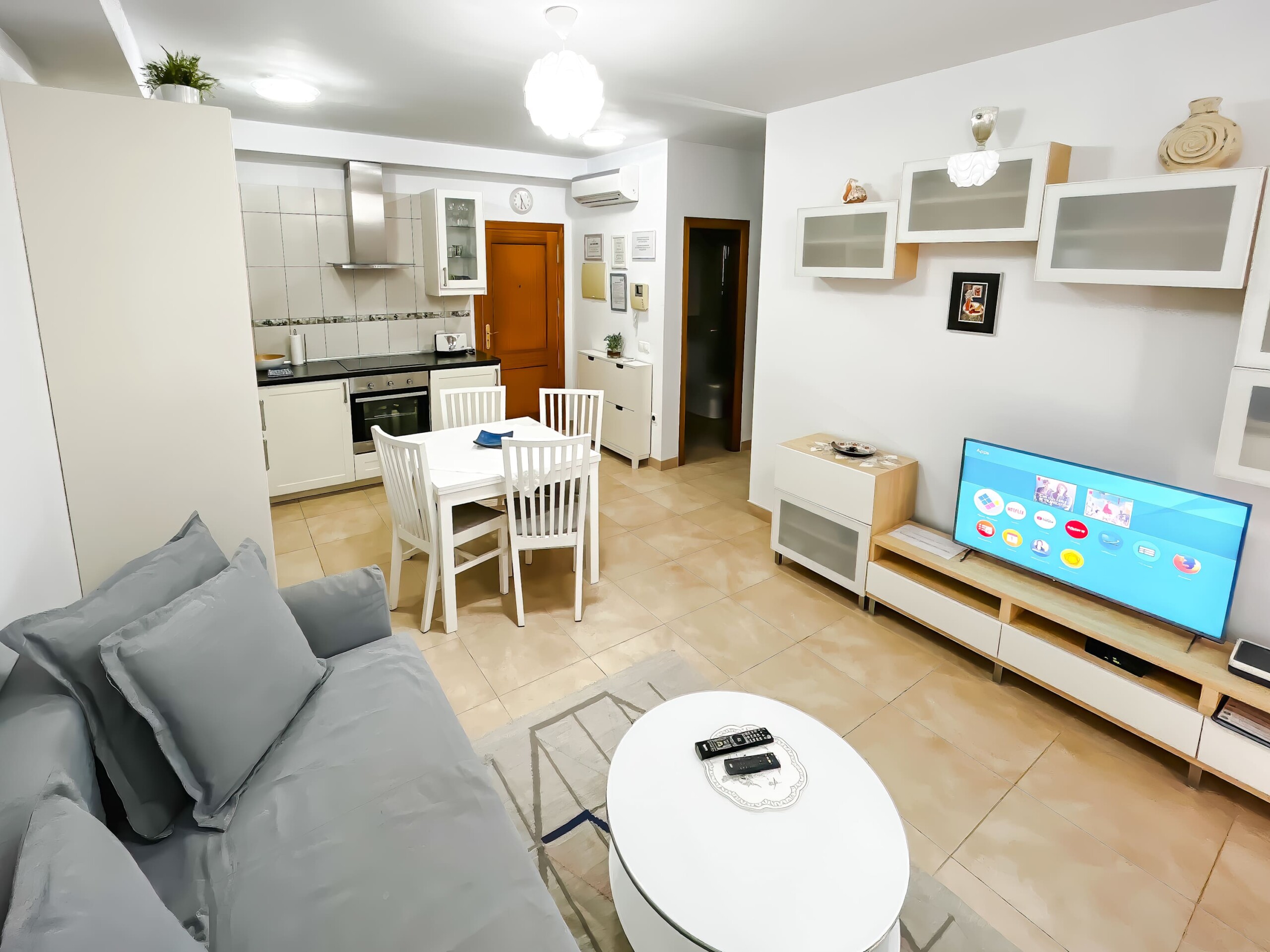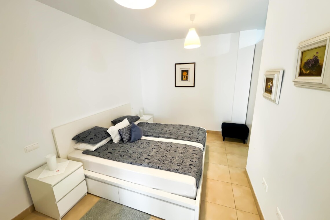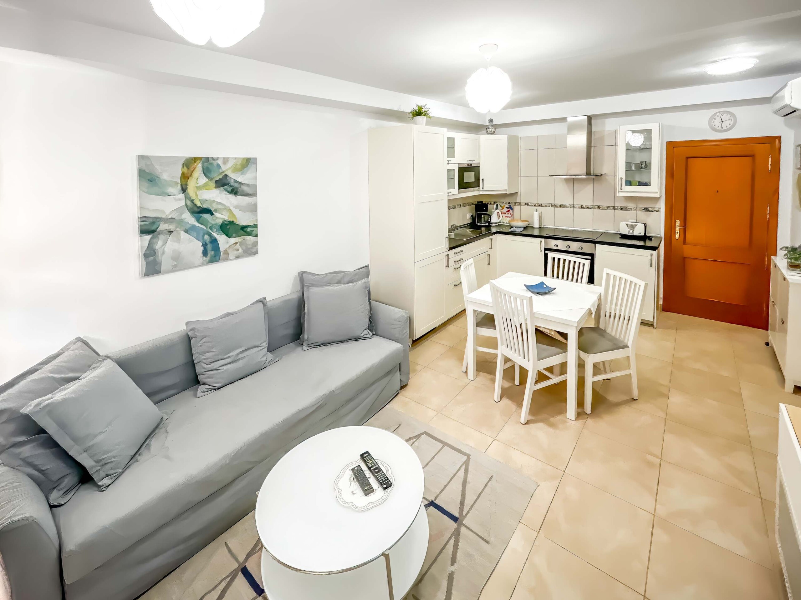 Step inside this charming apartment and discover a thoughtfully designed space perfect for your holiday. The apartment features two comfortable bedrooms. The first bedroom boasts a luxurious king-size bed, providing a restful sanctuary. The second bedroom offers a single bed, ideal for a child or individual guest. Both bedrooms offer access to the balcony. The living room is a welcoming space, furnished with a cozy sofa bed, perfect for relaxing after a day of exploration. The living room also opens to the balcony, extending your living space outdoors. The fully equipped kitchen allows you to prepare your own meals. It includes a coffee maker, cookware, dishes, silverware, microwave, oven, and refrigerator. The apartment also includes a full bathroom, ensuring privacy and convenience. Step outside onto the private roof terrace, a highlight of this apartment. Enjoy breathtaking sea and mountain views from the sun loungers. This apartment is designed to provide a comfortable and convenient stay, with air conditioning and wireless internet included.