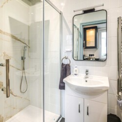 The bedroom contains a double bed, offering a comfortable and restful retreat, complete with bedside tables and reading lamps for added convenience. A private and modern shower room, equipped with contemporary fixtures and amenities for your convenience, such as a walk-in shower and ample storage space.