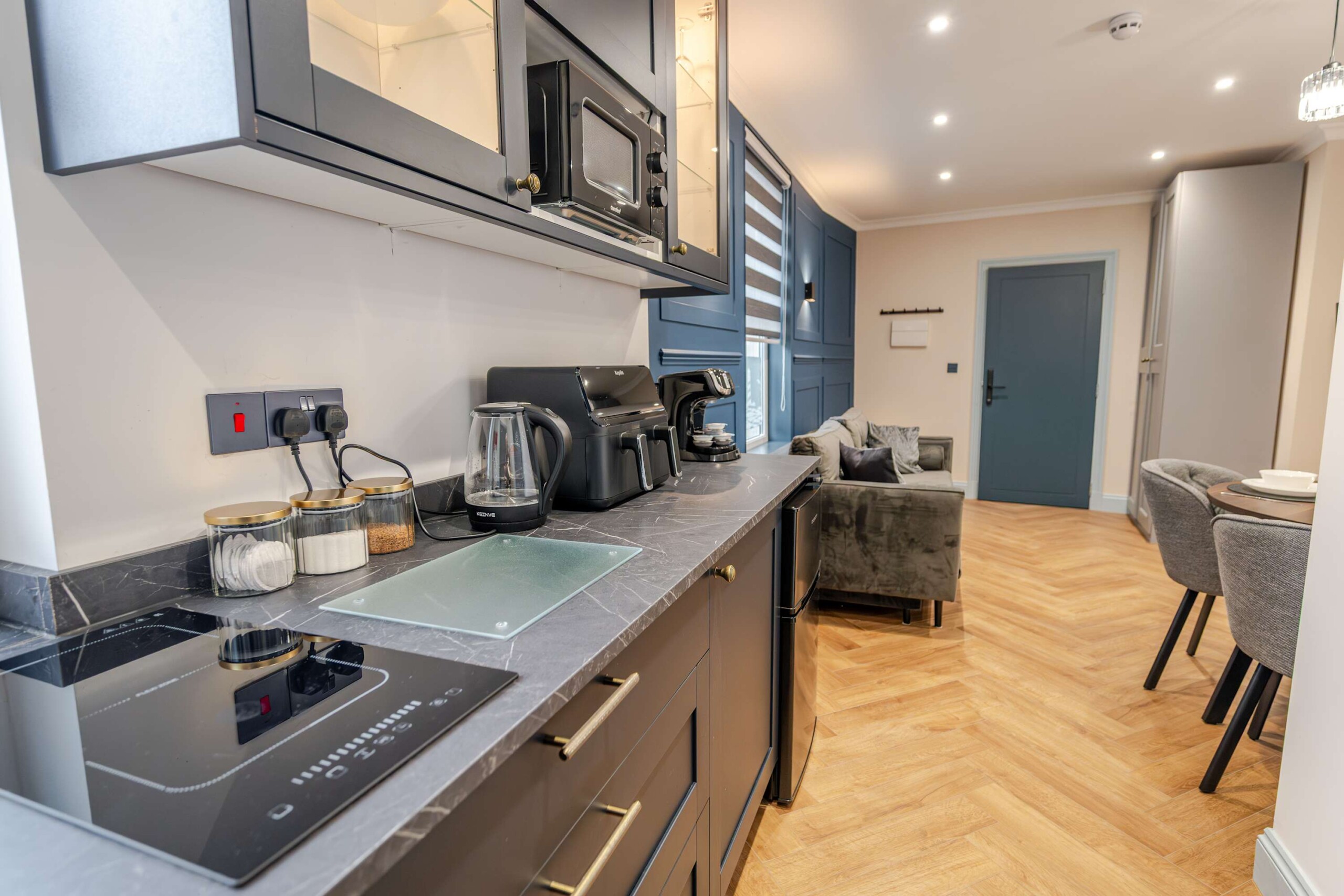 A cosy lounge includes sofa bed, smart TV and dining table for your nights in. after a hard day exploring the surrounding area. The kitchen has everything you could possibly need for your stay including utensils, kettle, toaster, fridge, microwave and hob. Please note there is no oven.