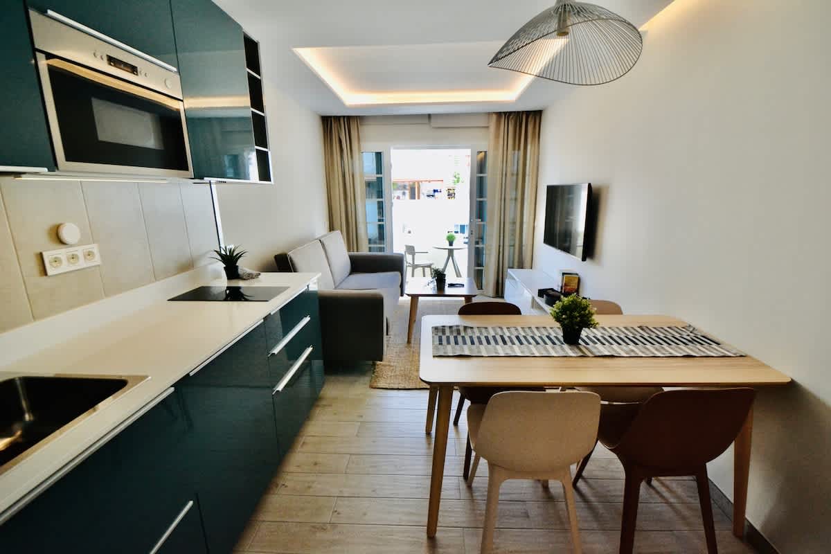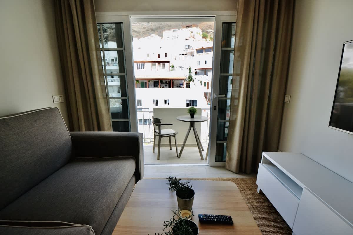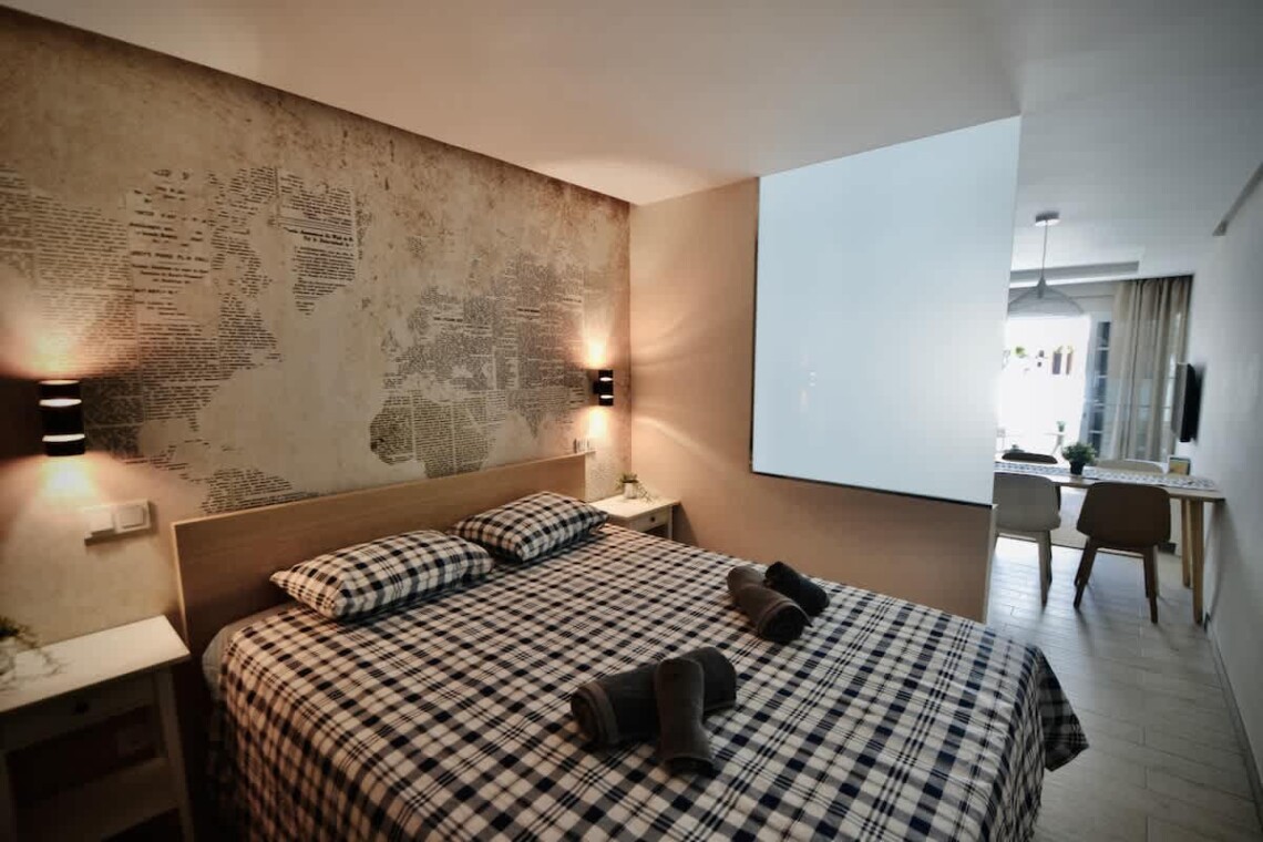 This modern, light-filled studio apartment is ideally located in Puerto de Mogán, offering easy access to the beach and waterfront. Recently renovated and beautifully furnished, the space features contemporary décor, a comfortable bed with quality linens, and stylish touches including an artistic globe wall print and ample built-in storage.