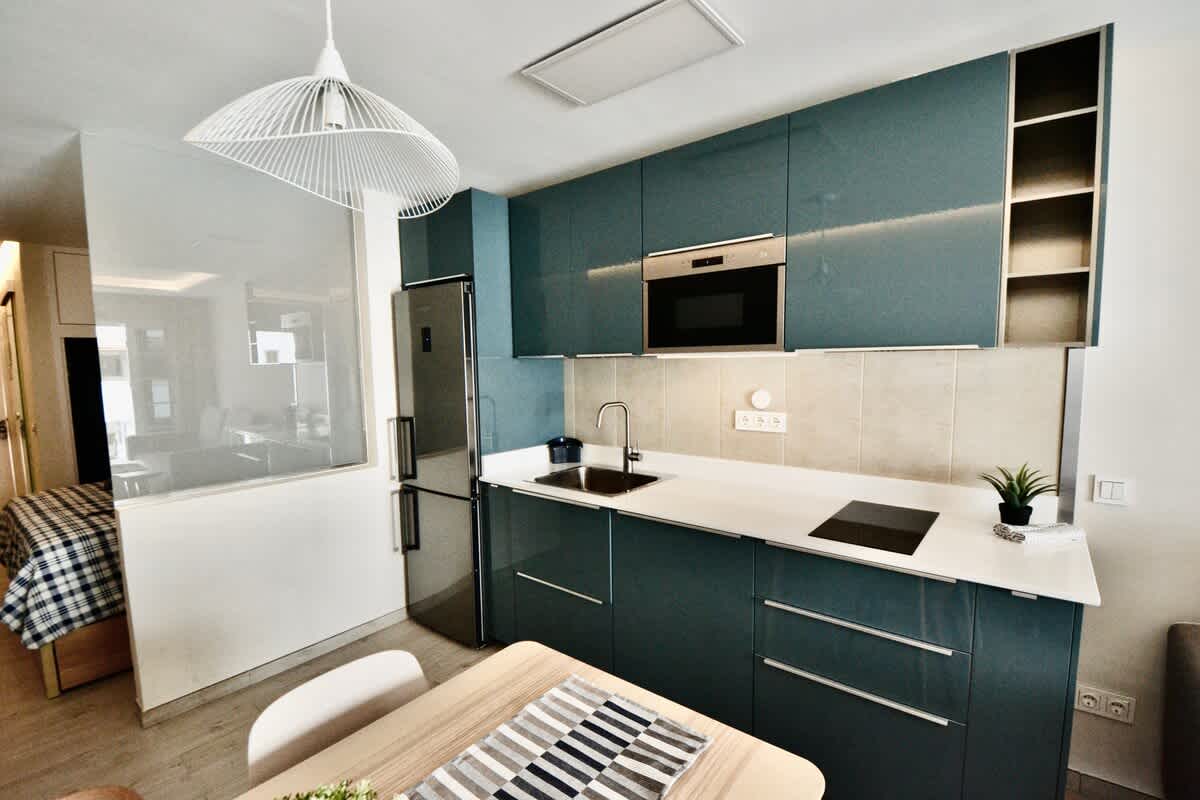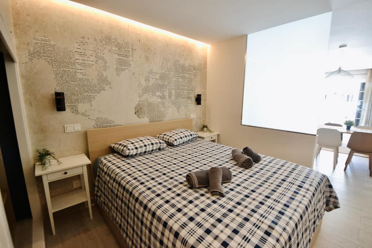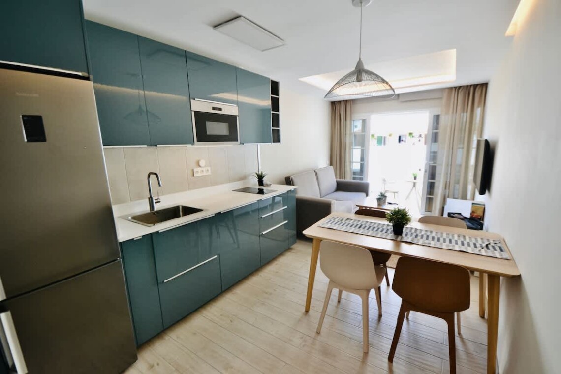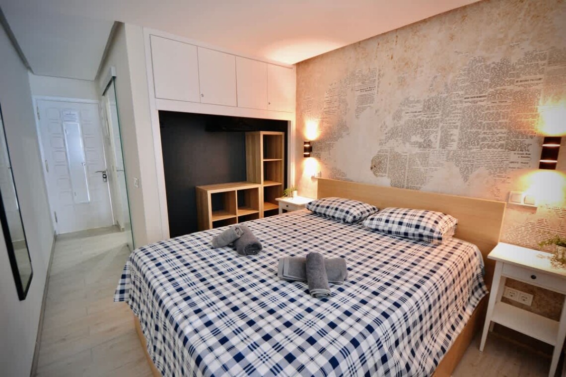 This modern, light-filled studio apartment is ideally located in Puerto de Mogán, offering easy access to the beach and waterfront. Recently renovated and beautifully furnished, the space features contemporary décor, a comfortable bed with quality linens, and stylish touches including an artistic globe wall print and ample built-in storage.