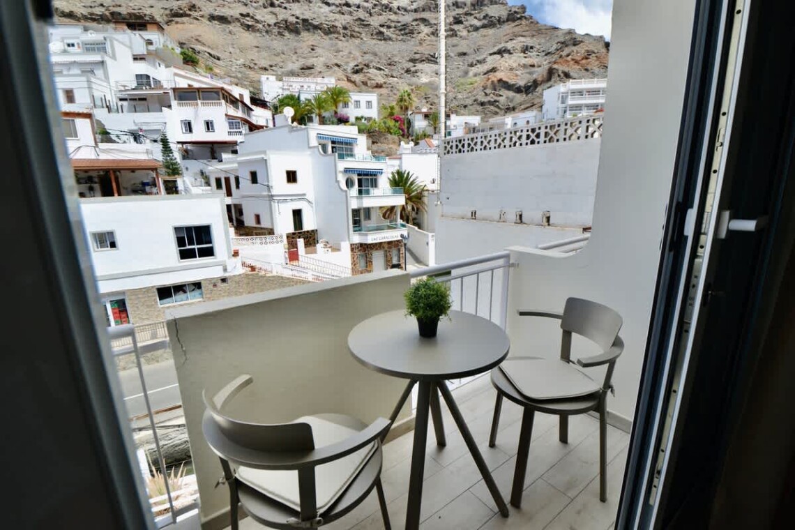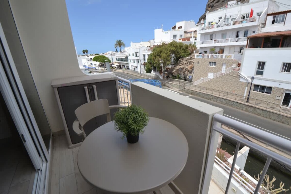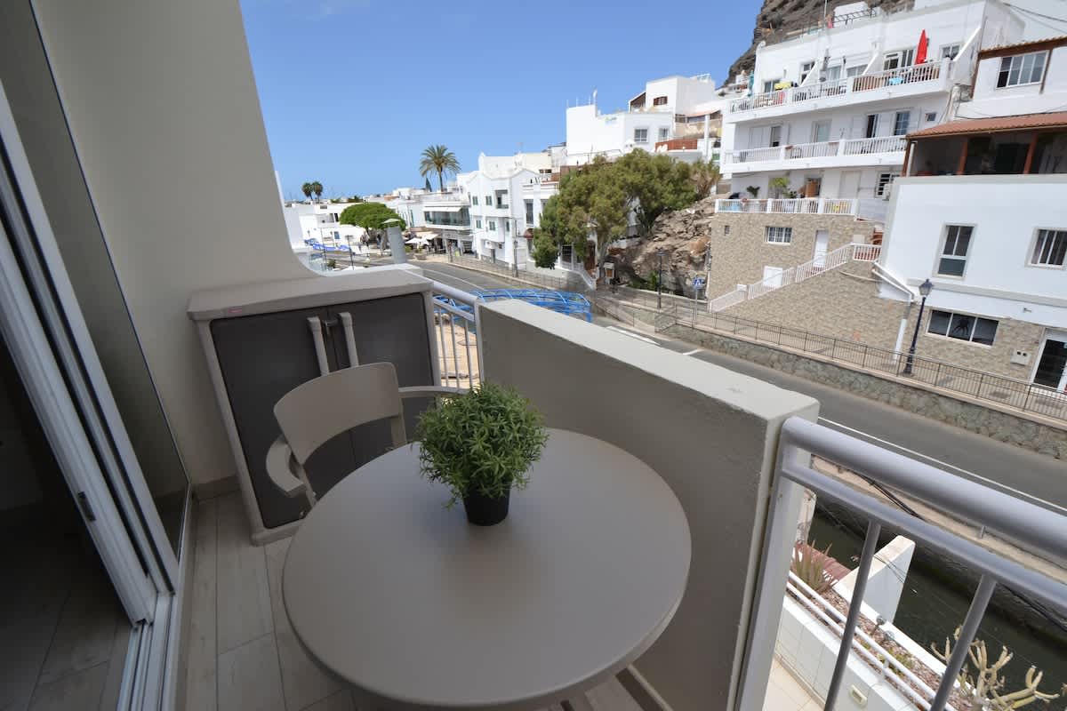 Enjoy a stylish stay in this newly renovated studio in the heart of Playa de Mogán. Just 50 metres from the beach, marina, restaurants and shops, everything is on your doorstep. Unwind on the shared rooftop terrace with beautiful views, sun loungers and umbrellas. Inside you’ll find a comfy bed, modern shower room with washing machine, fully equipped kitchen, Wi-Fi, TV, and a private balcony—perfect for morning coffee or evening wine.