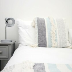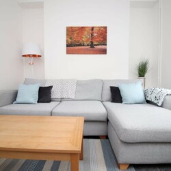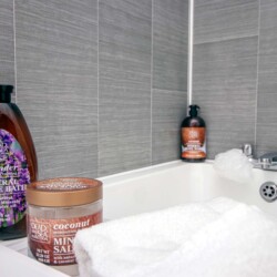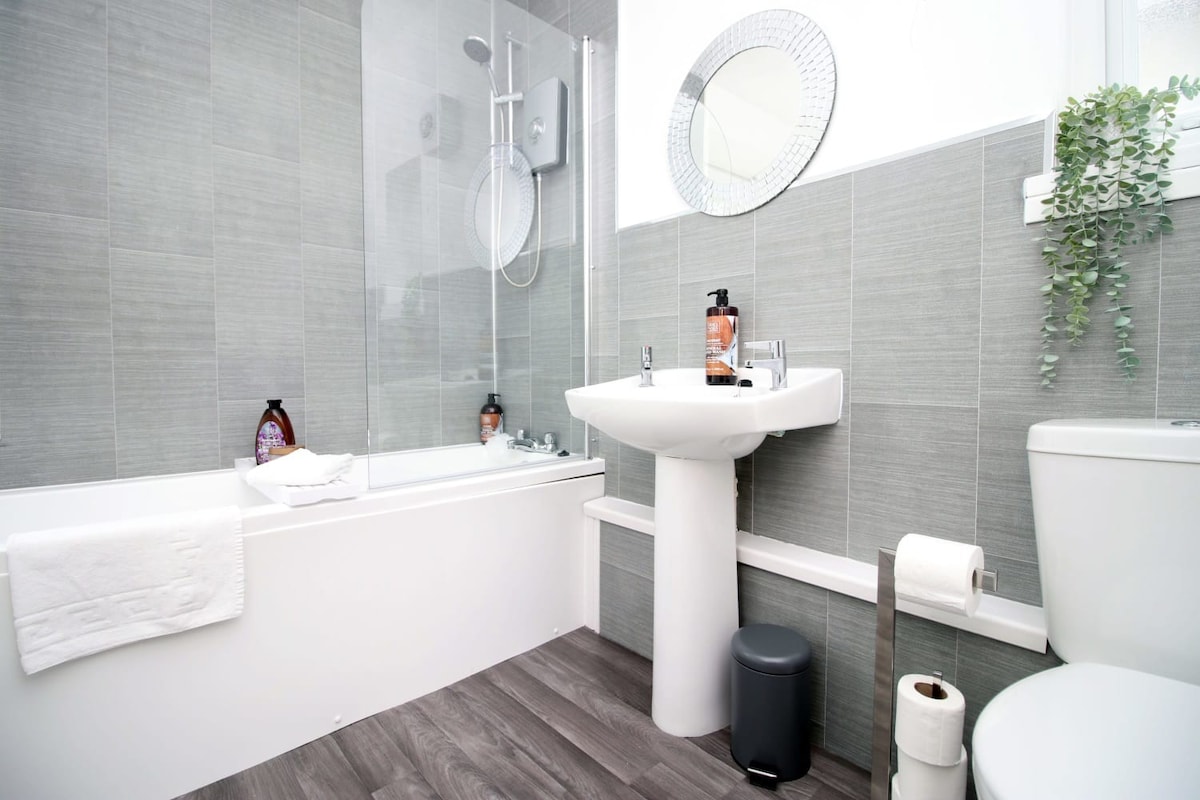 Upstairs, you’ll find a lovely modern bathroom with a bath and over-bath shower, hand basin, and toilet.