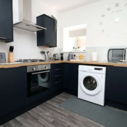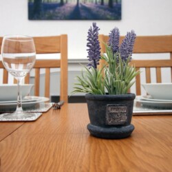 The fully equipped kitchen features a full-height fridge/freezer, washing machine with dryer, and the all-important Tassimo coffee machine. We supply a few pods for a welcome drink, but feel free to bring your own favorite pods. The kitchen is fully stocked with utensils, pots, and pans, catering to your every culinary need.