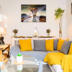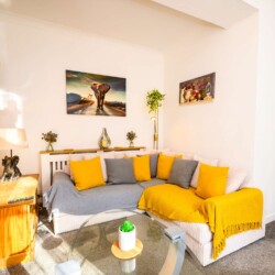 The well-equipped kitchen includes a dishwasher, refrigerator, stove, microwave, and oven, along with coffee maker, cookware and dishes, all ready to prepare meals to be enjoyed at the dining table. The living area is designed for relaxation, offering a space to unwind after a day of exploring or work.
