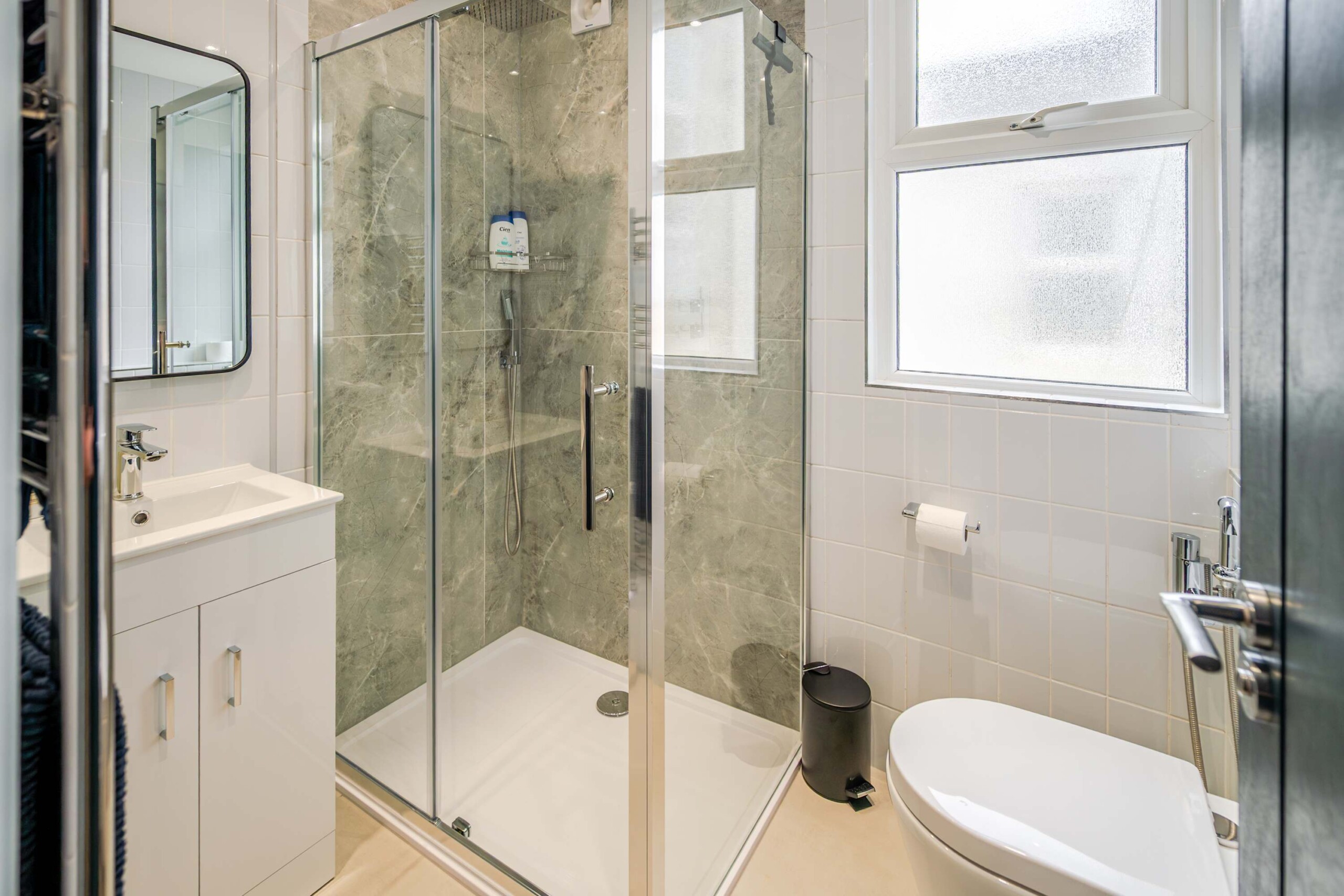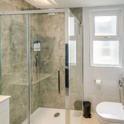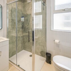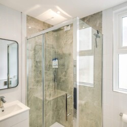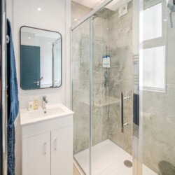 A private and modern shower room, equipped with contemporary fixtures and amenities for your convenience, such as a walk-in shower and ample storage space.