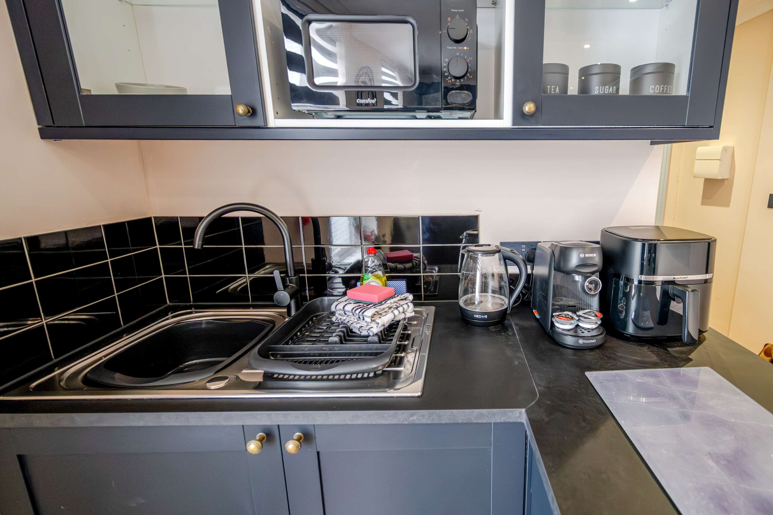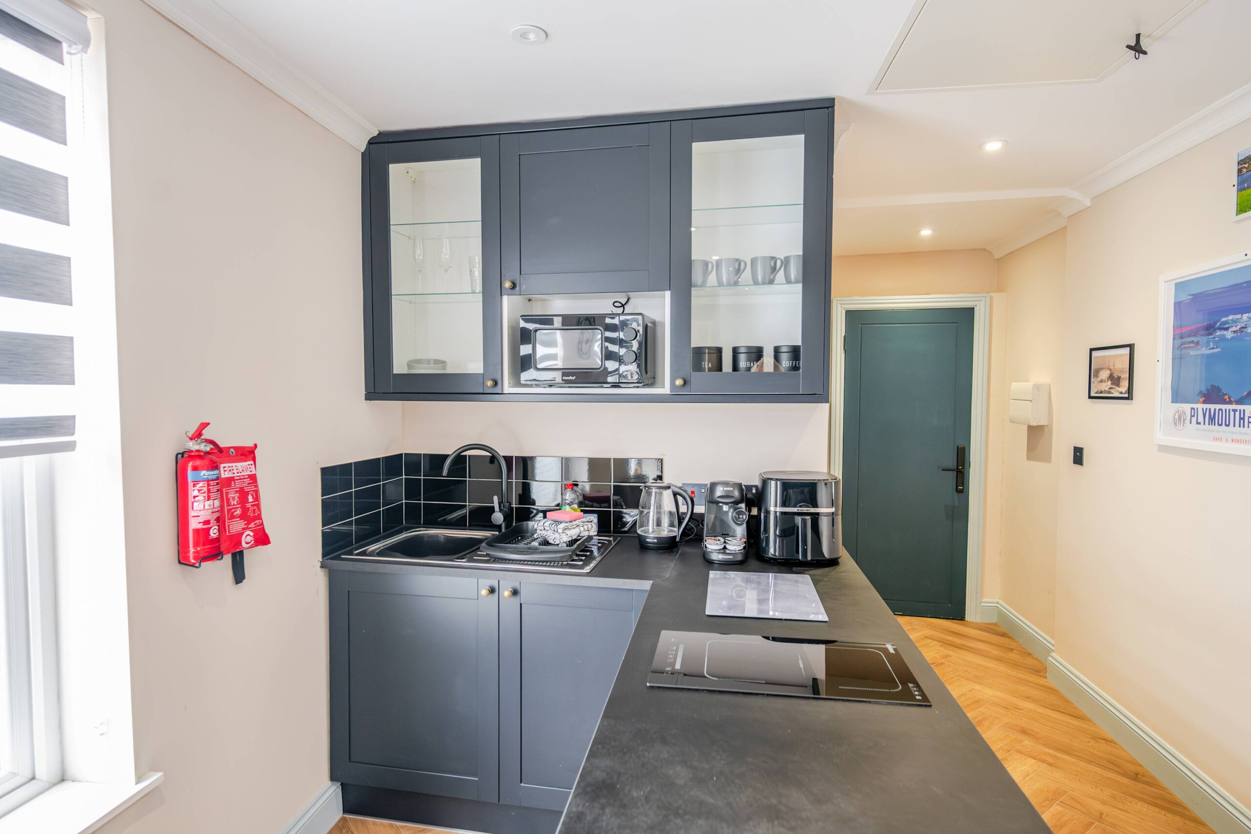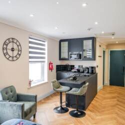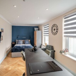 The entrance to the building is on Devonport Road. next to Stoke Barbers. When you enter through the front door, you will go up some stairs to find the entrance to the apartment. A thoughtfully designed studio apartment, perfect for a relaxing getaway for up to two people. The apartment features a single-level layout, with an open plan living area and kitchen.