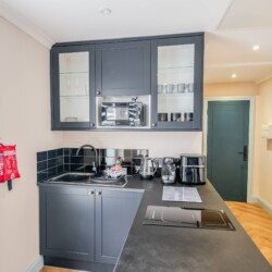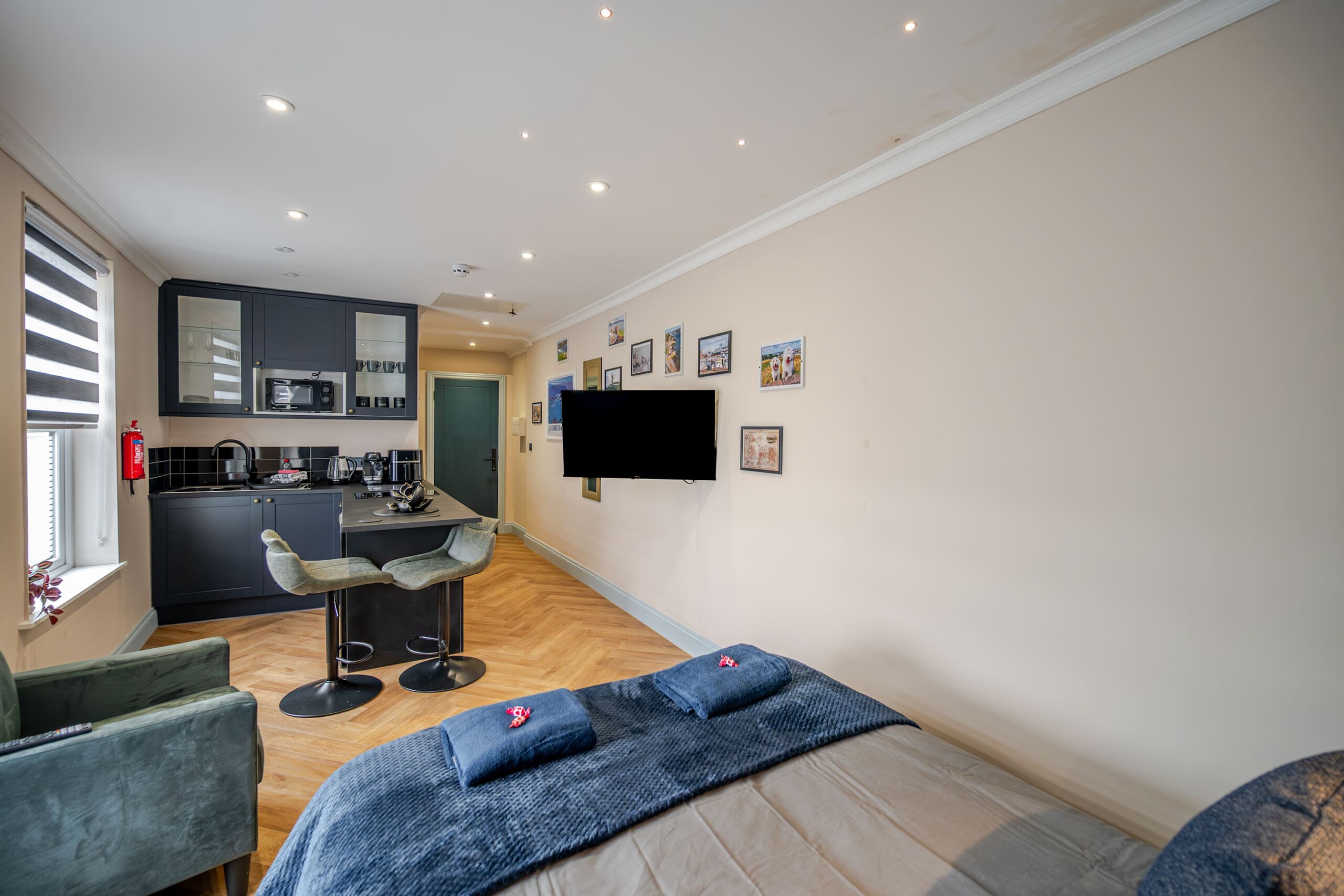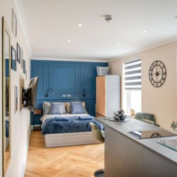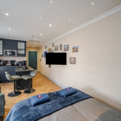 A cosy lounge includes sofa, smart TV and dining table for your nights in. after a hard day exploring the surrounding area. The kitchen has everything you could possibly need for your stay including utensils, kettle, toaster, fridge, microwave and hob. Please note there is no oven. The studio contains a double bed, offering a comfortable and restful retreat.